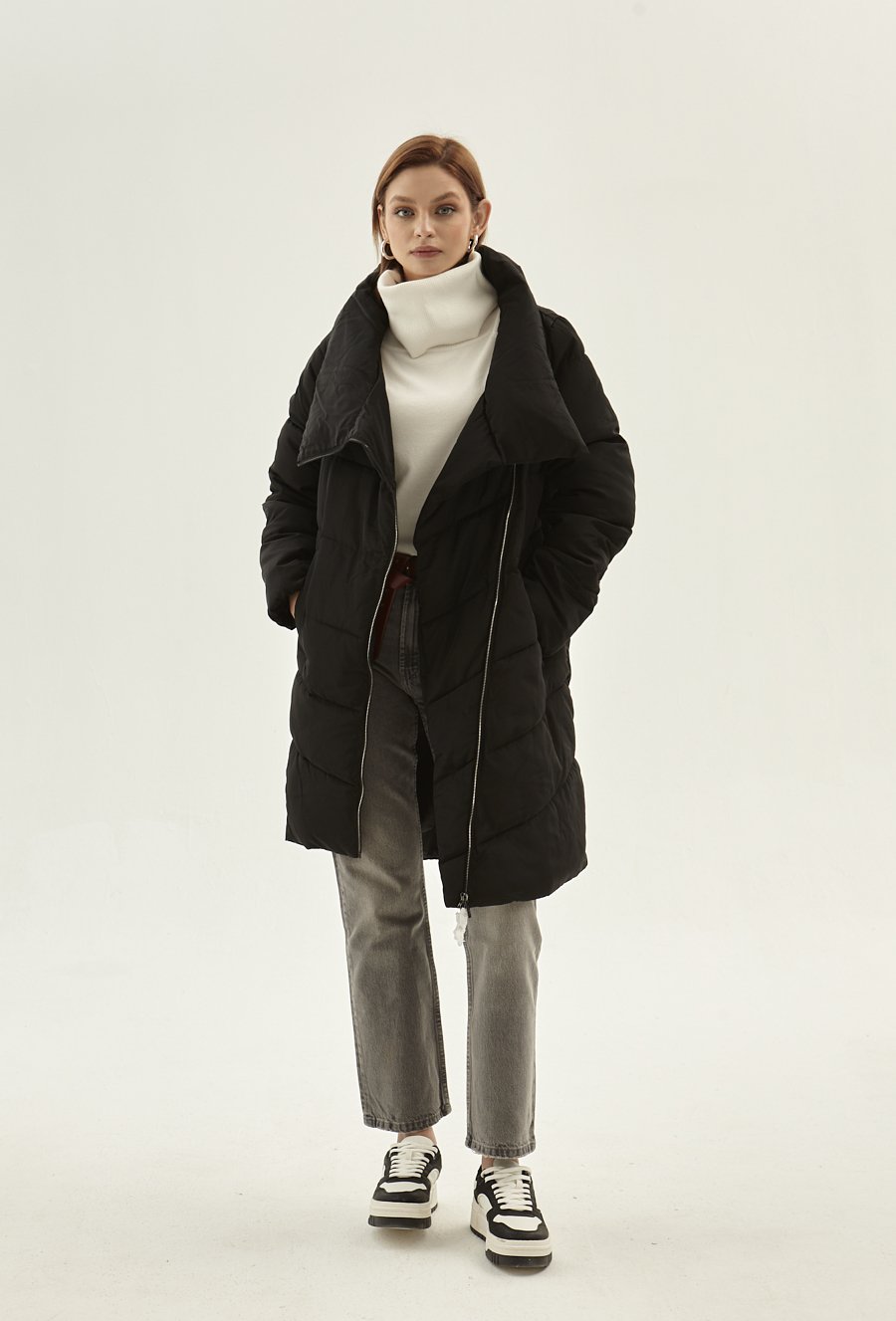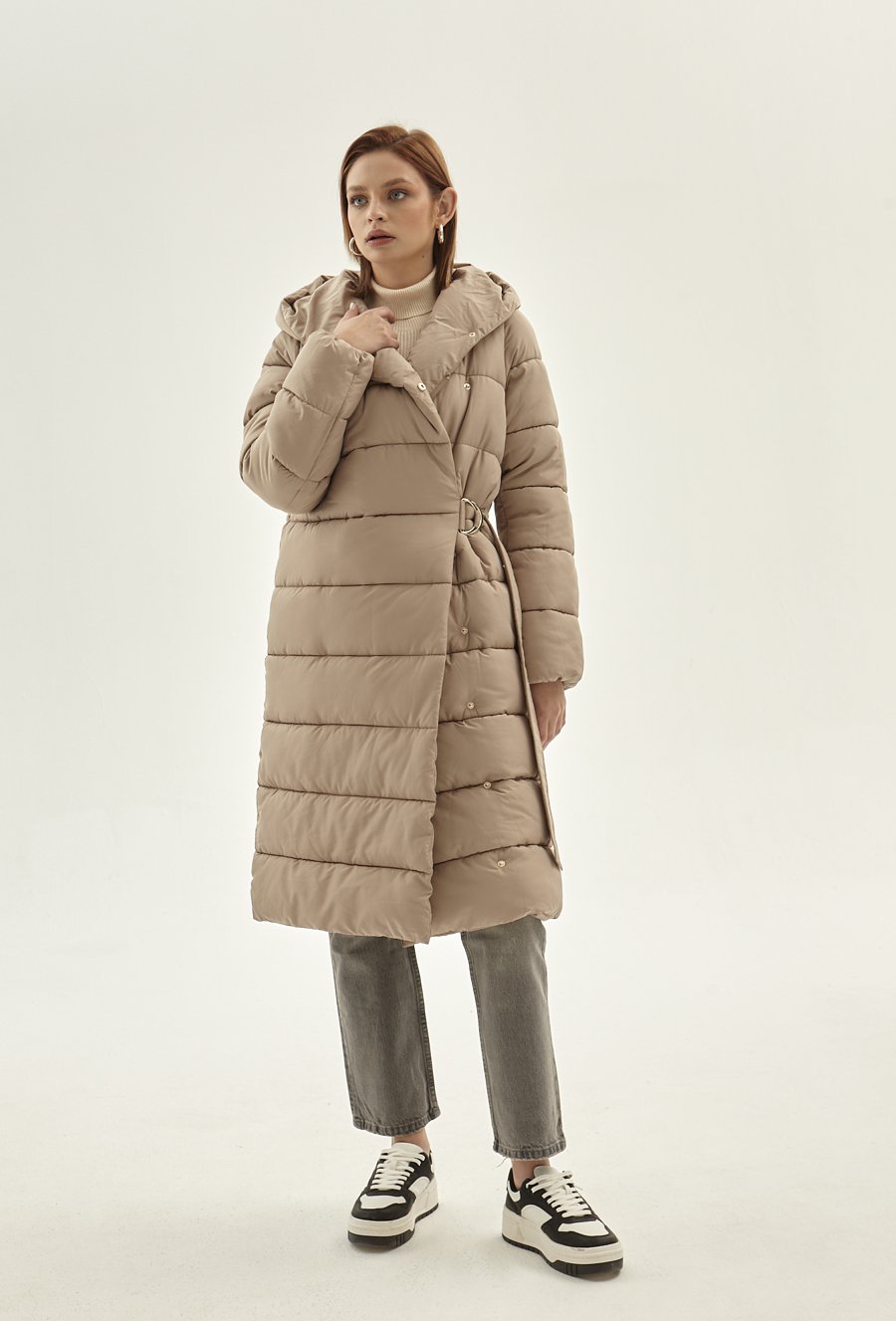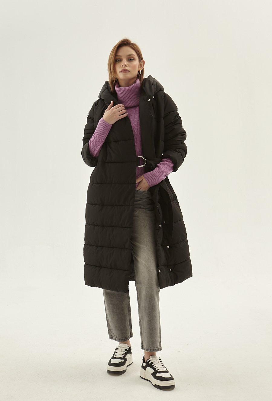 Długa kurtka z ozdobnym paskiem