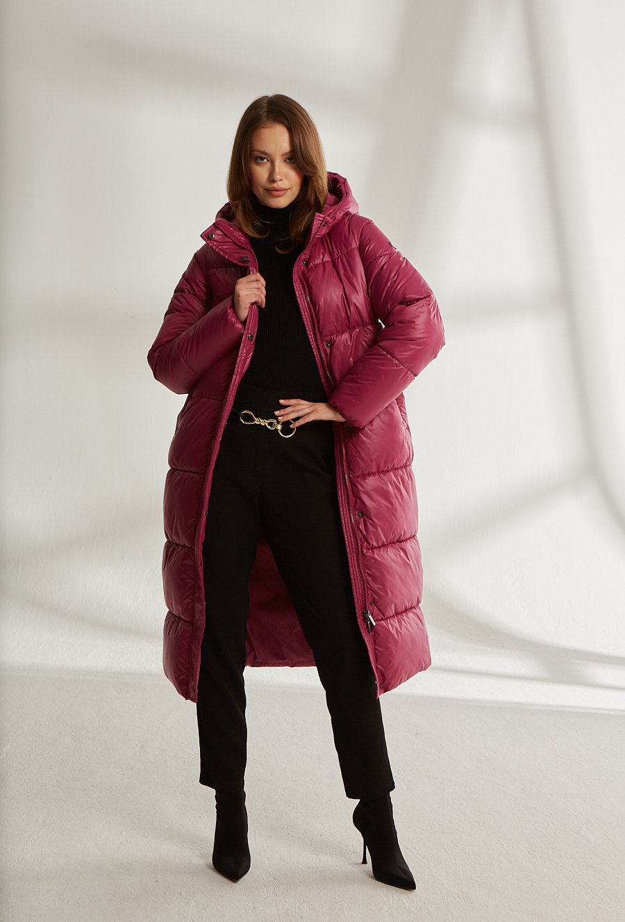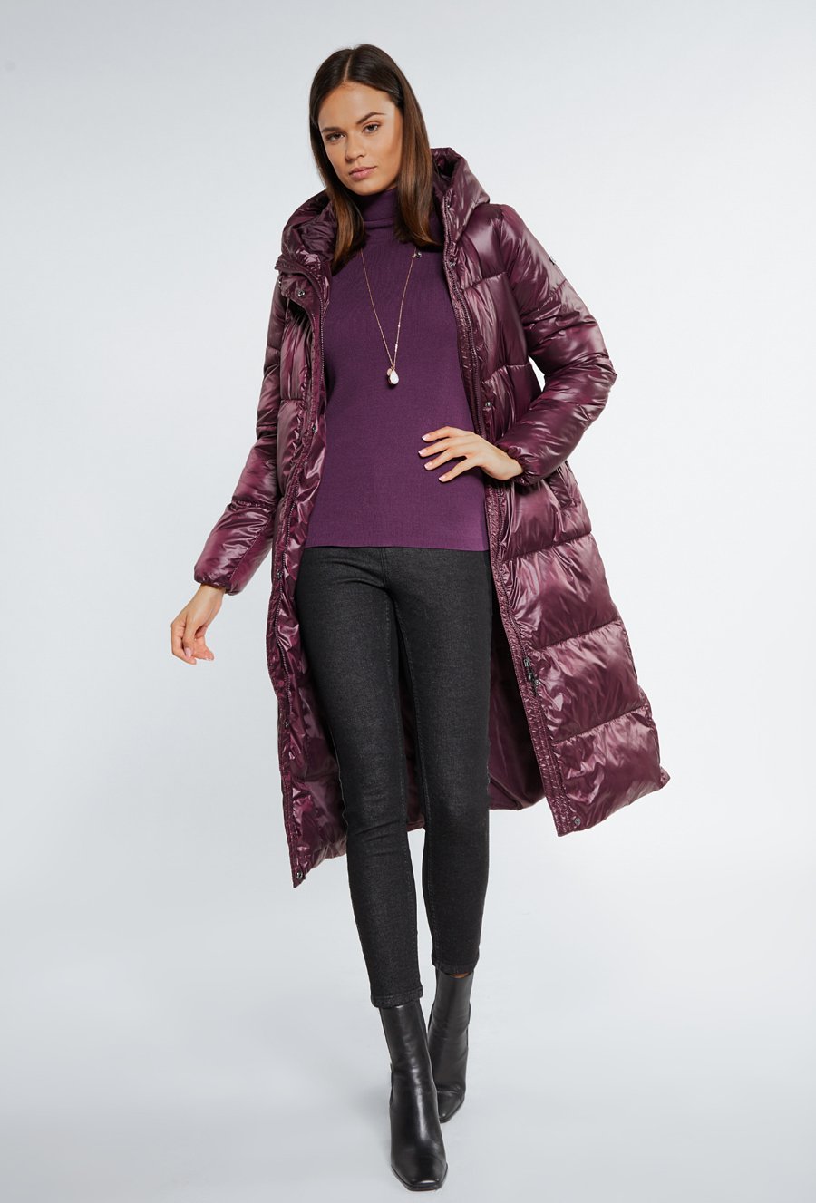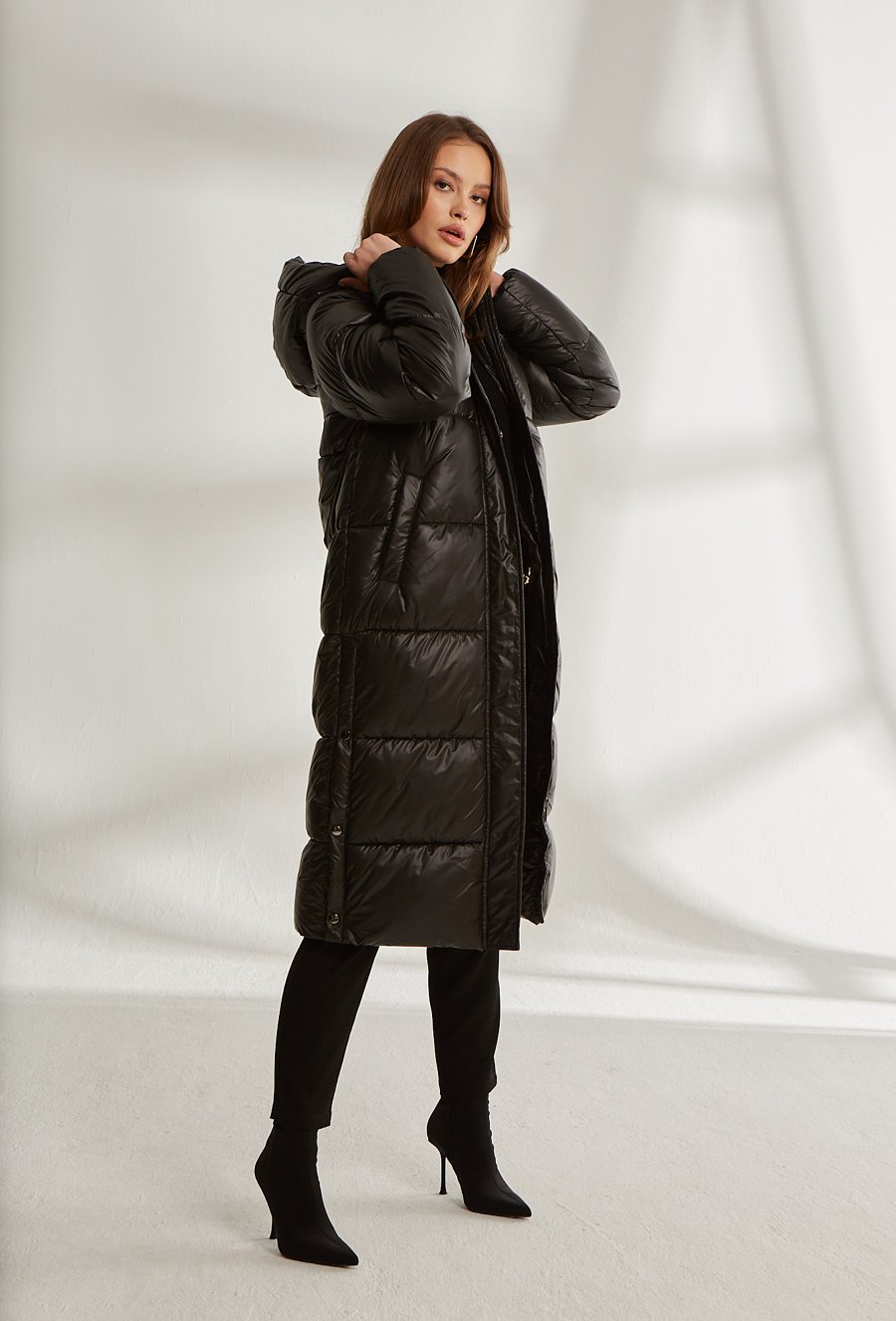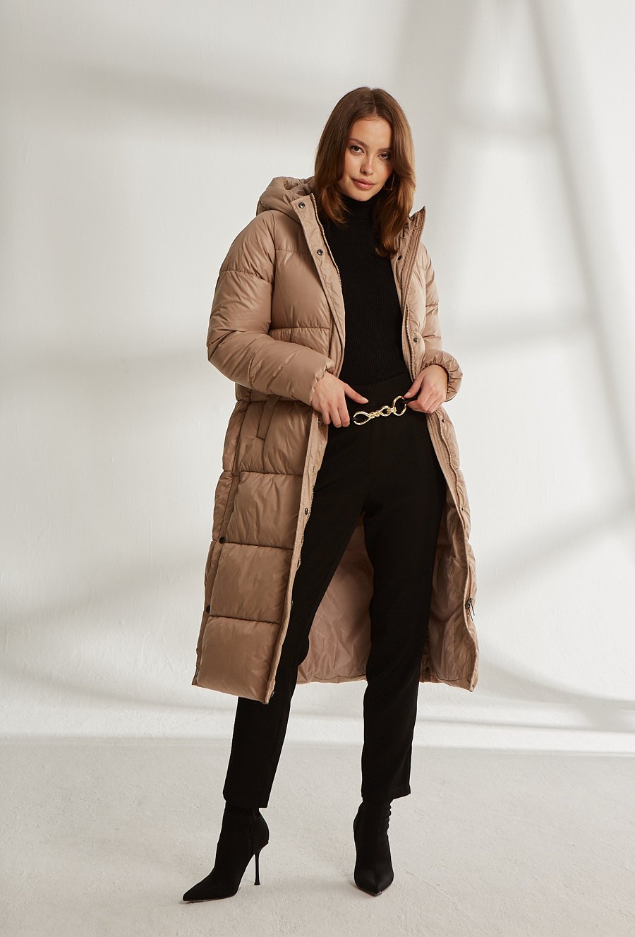 Długa pikowana kurtka z kapturem