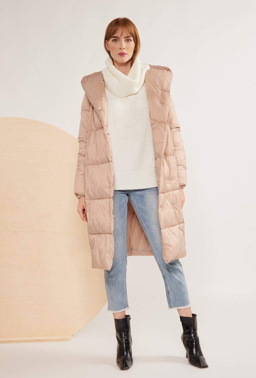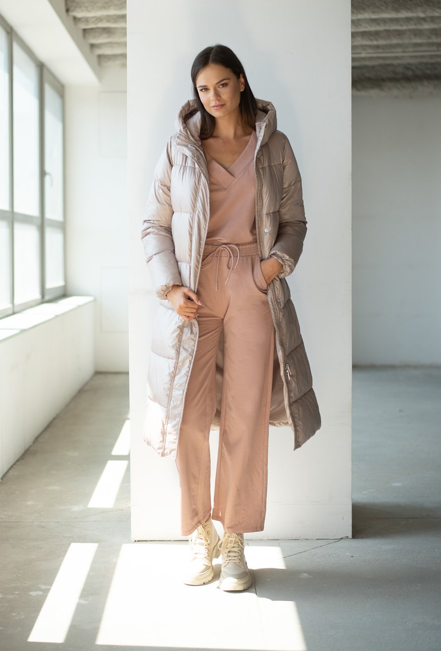 Długi pikowany płaszcz z kapturem