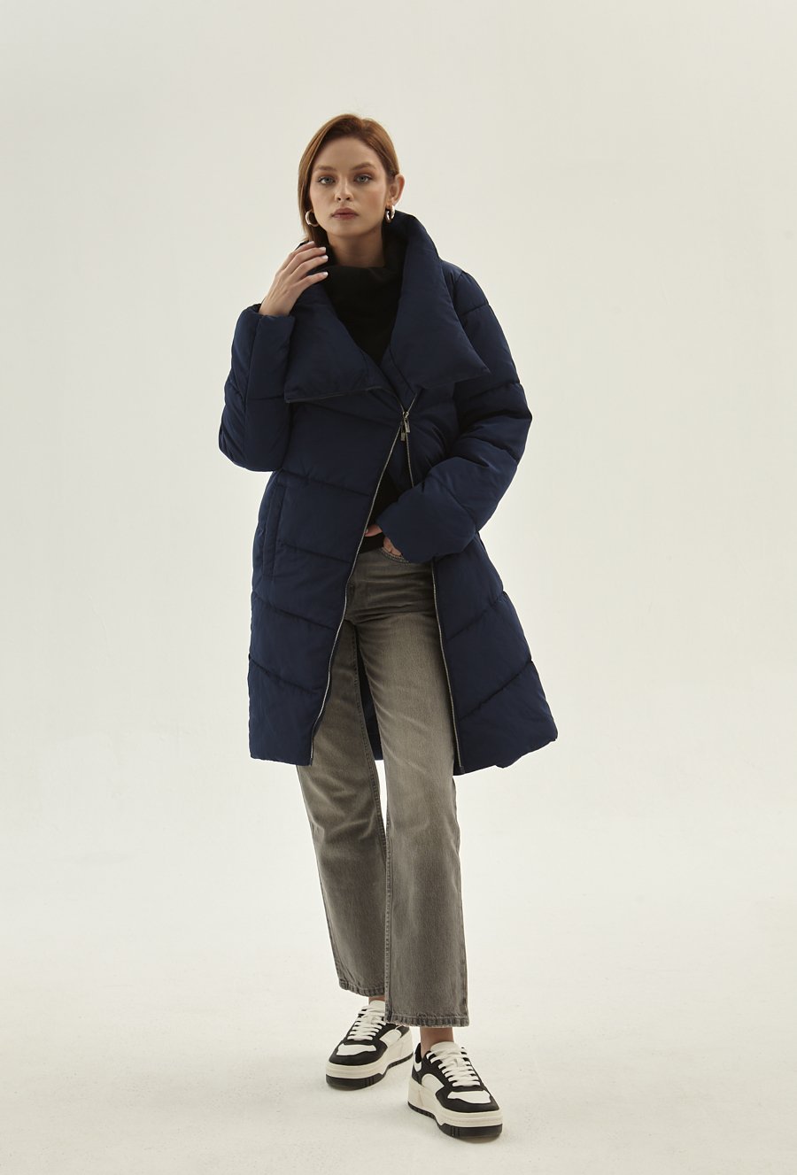 Granatowa pikowana kurtka z wysokim kołnierzem