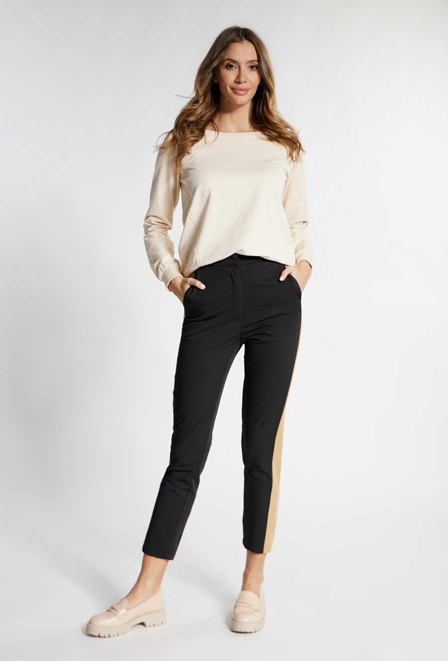Czarne spodnie z beżową lamówką