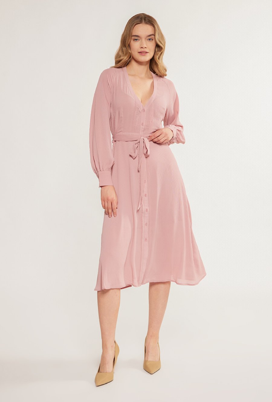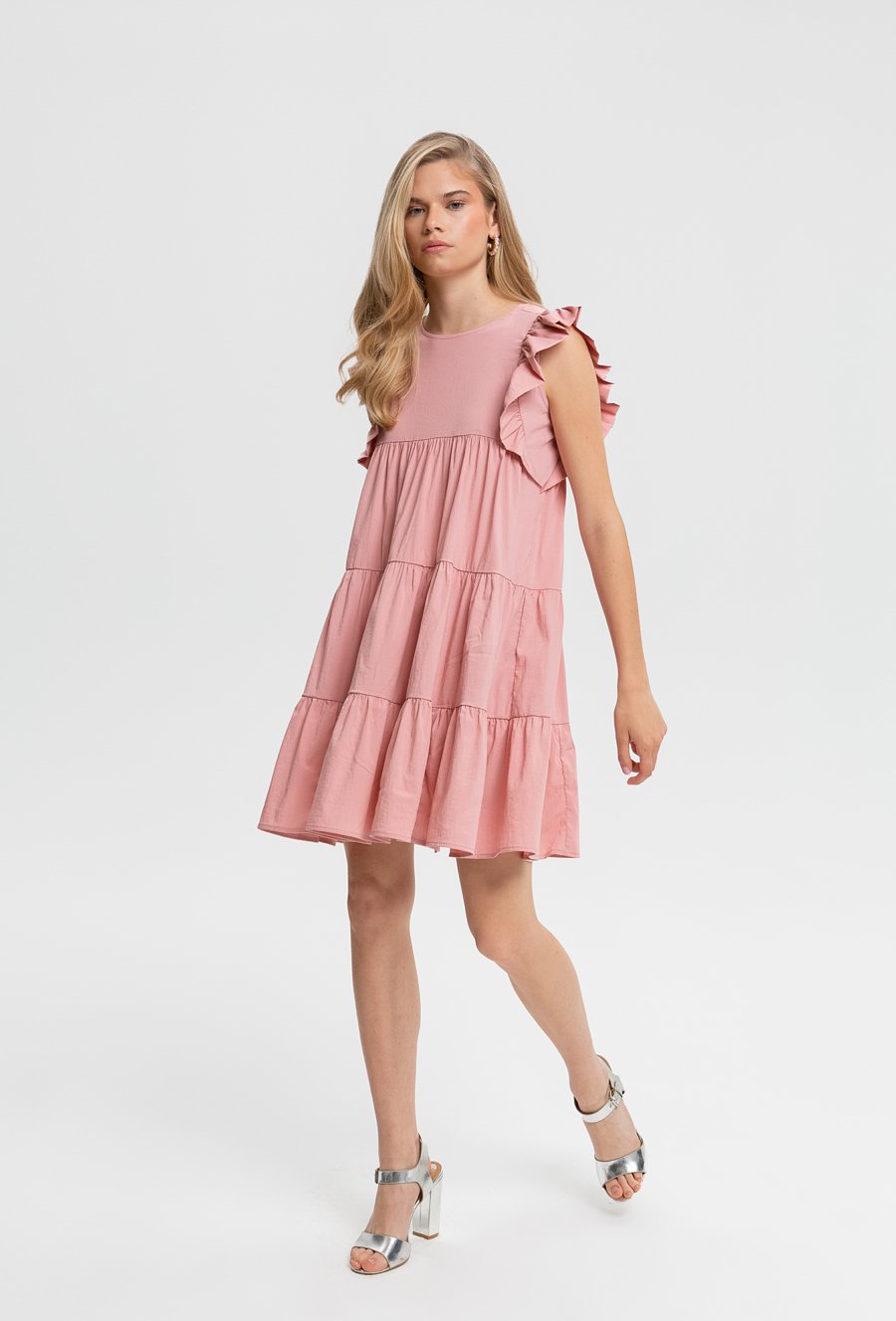 Różowa sukienka z falbaniastym rękawem