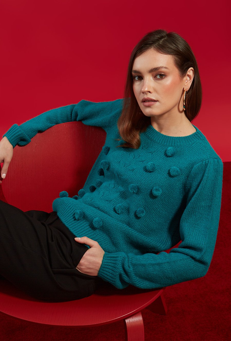 Zielony sweter z dekoracyjnymi kulkami