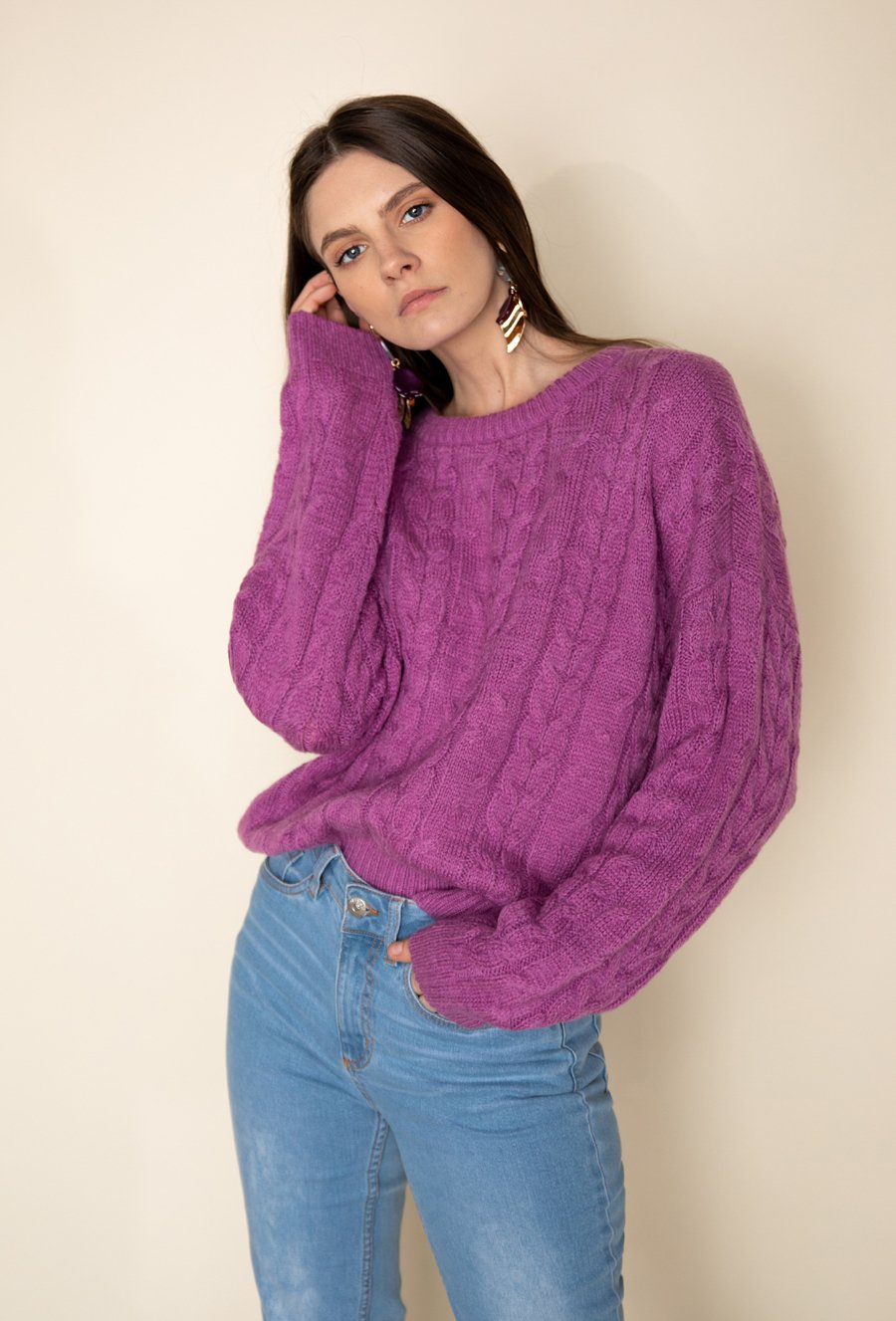 Fioletowy sweter o warkoczowym splocie