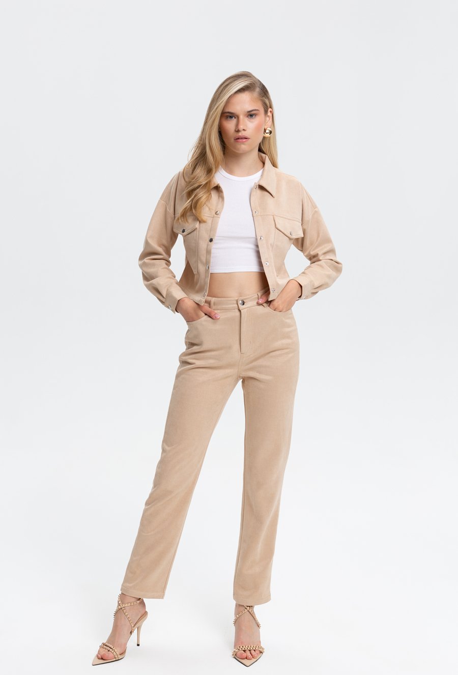 Beżowe spodnie z imitacji zamszu