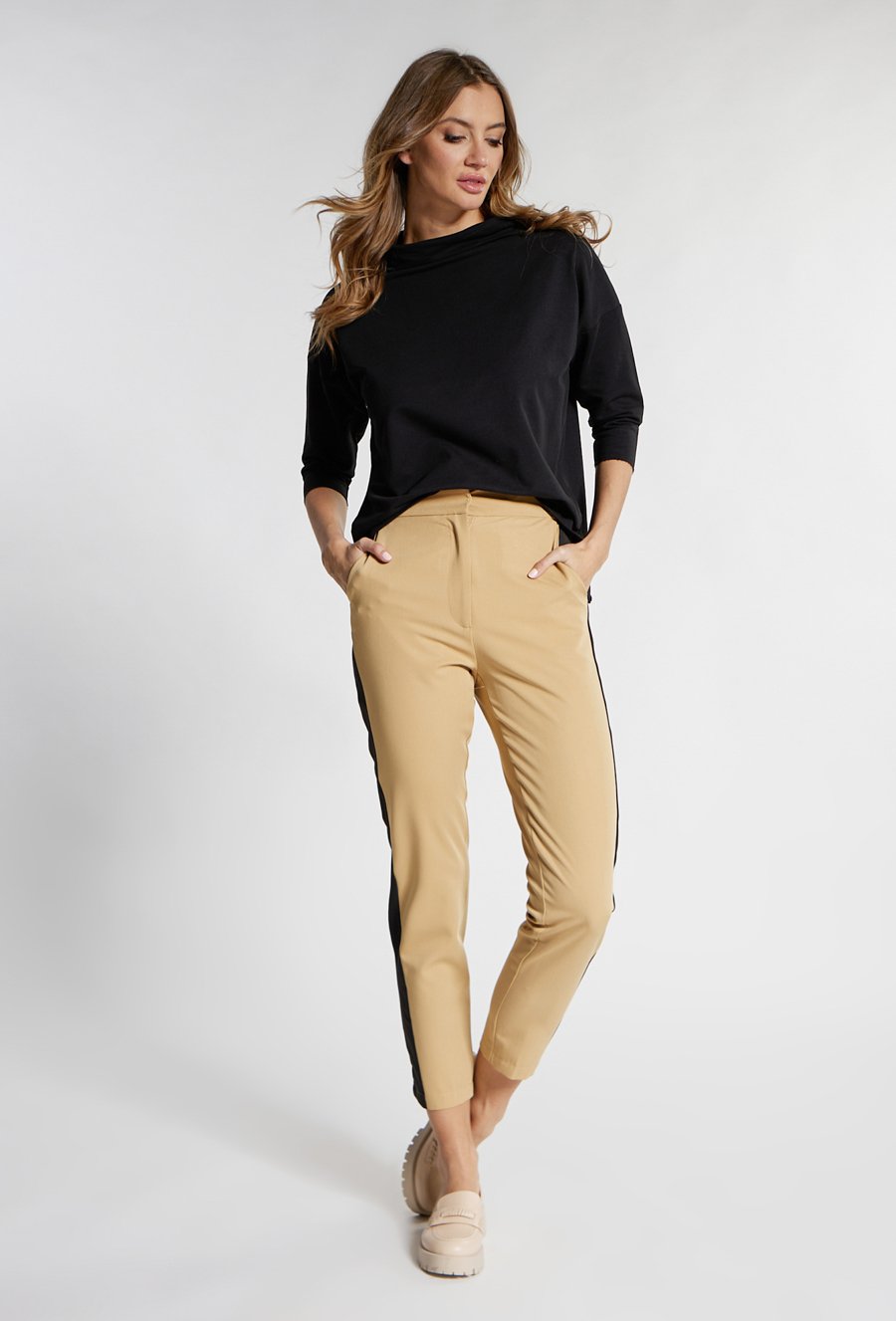 Beżowe spodnie z czarną lamówką