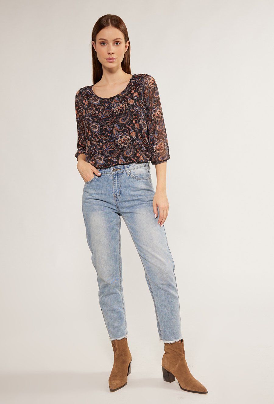 Wzorzysta bluzka z łączonych materiałów
