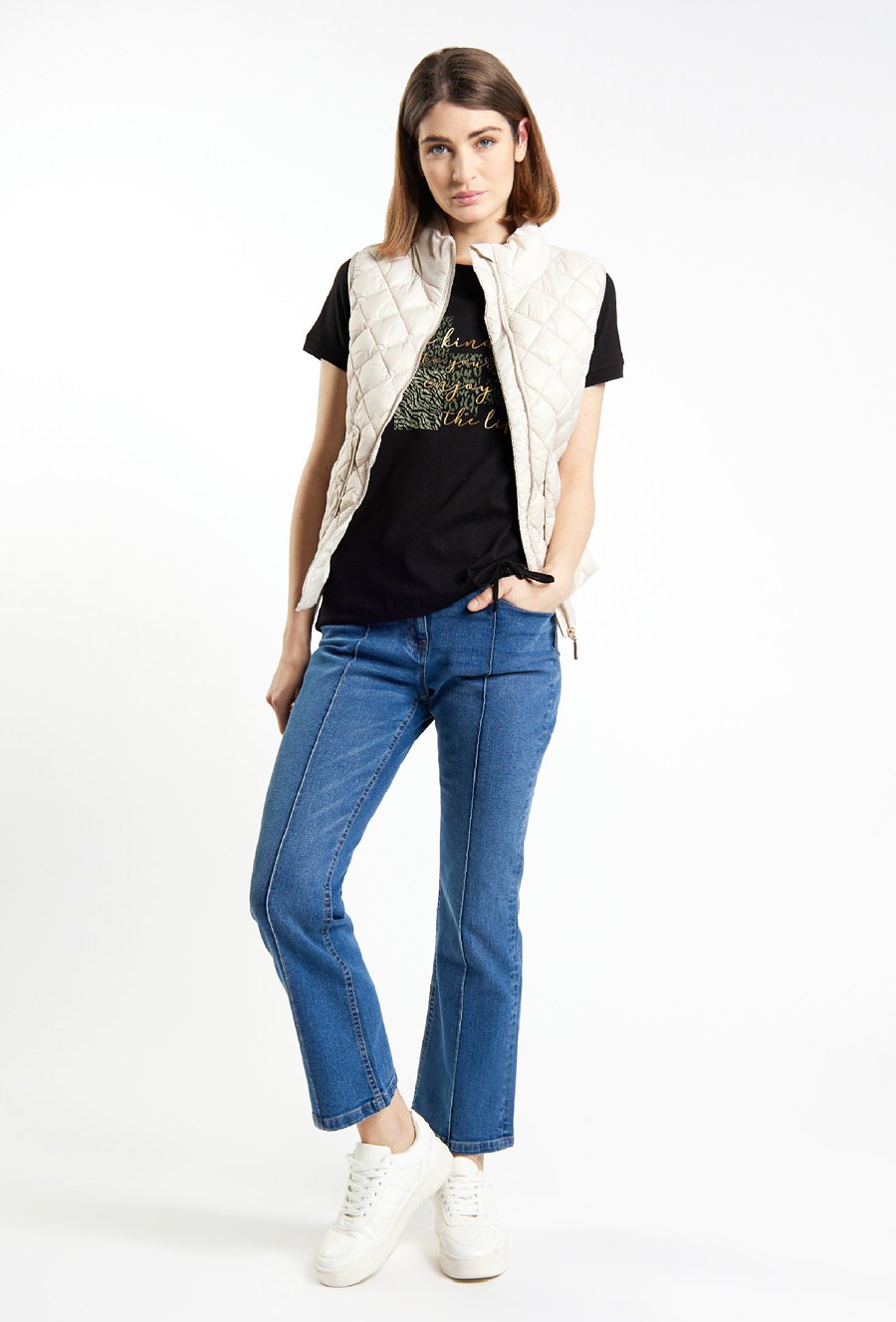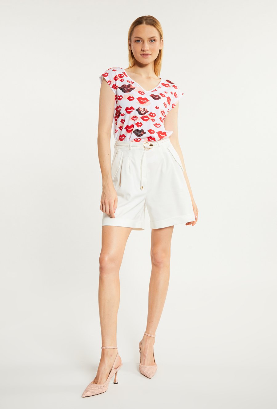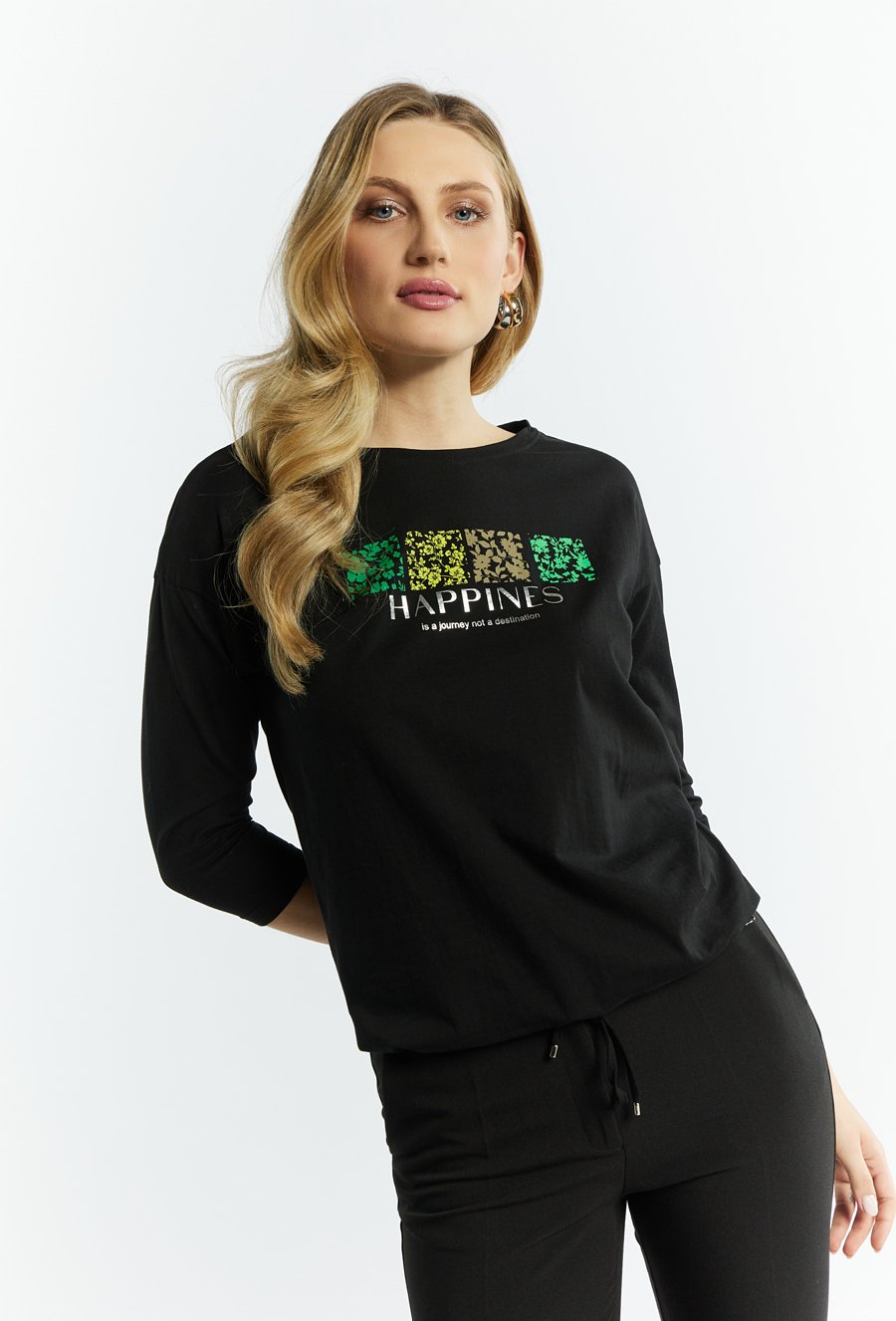 T-shirt damski z ozdobnymi cekinami i nadrukiem