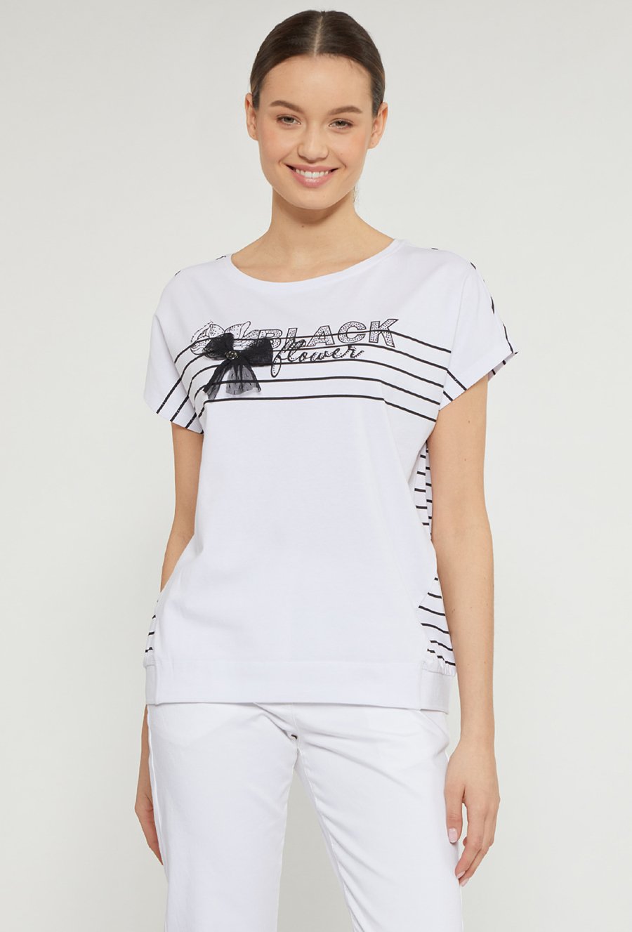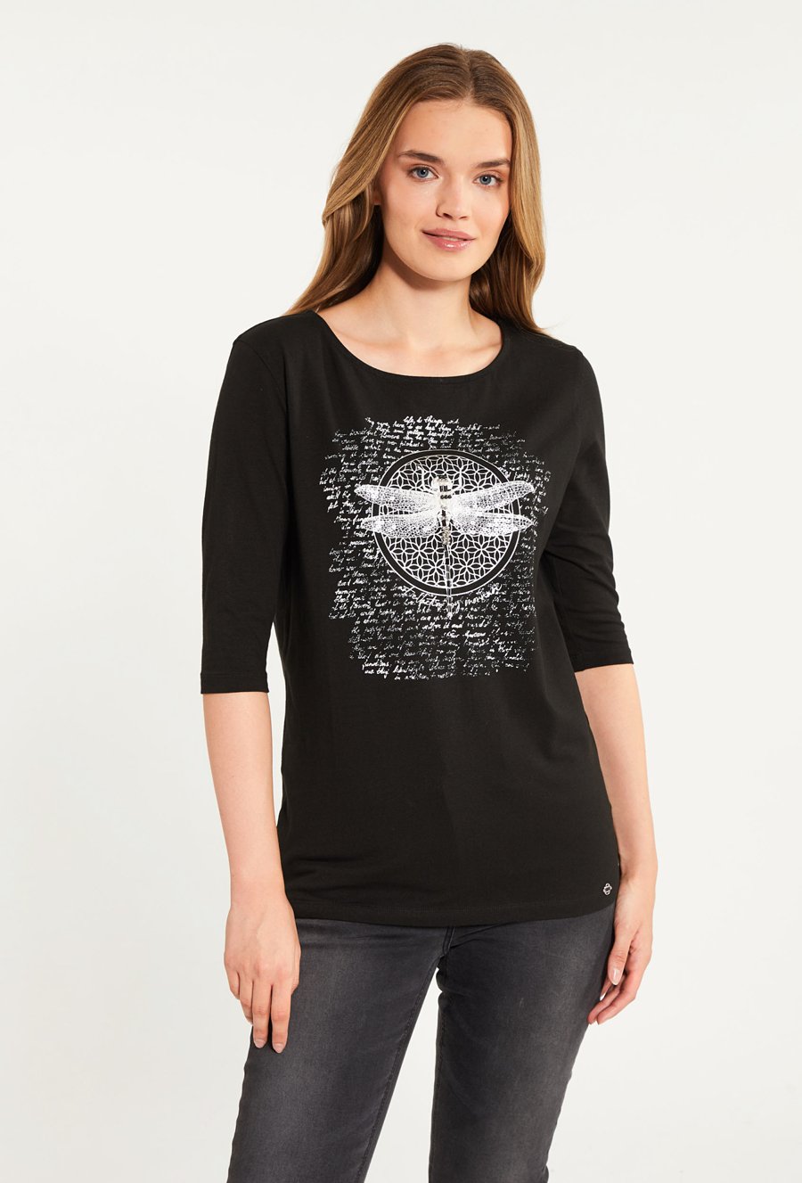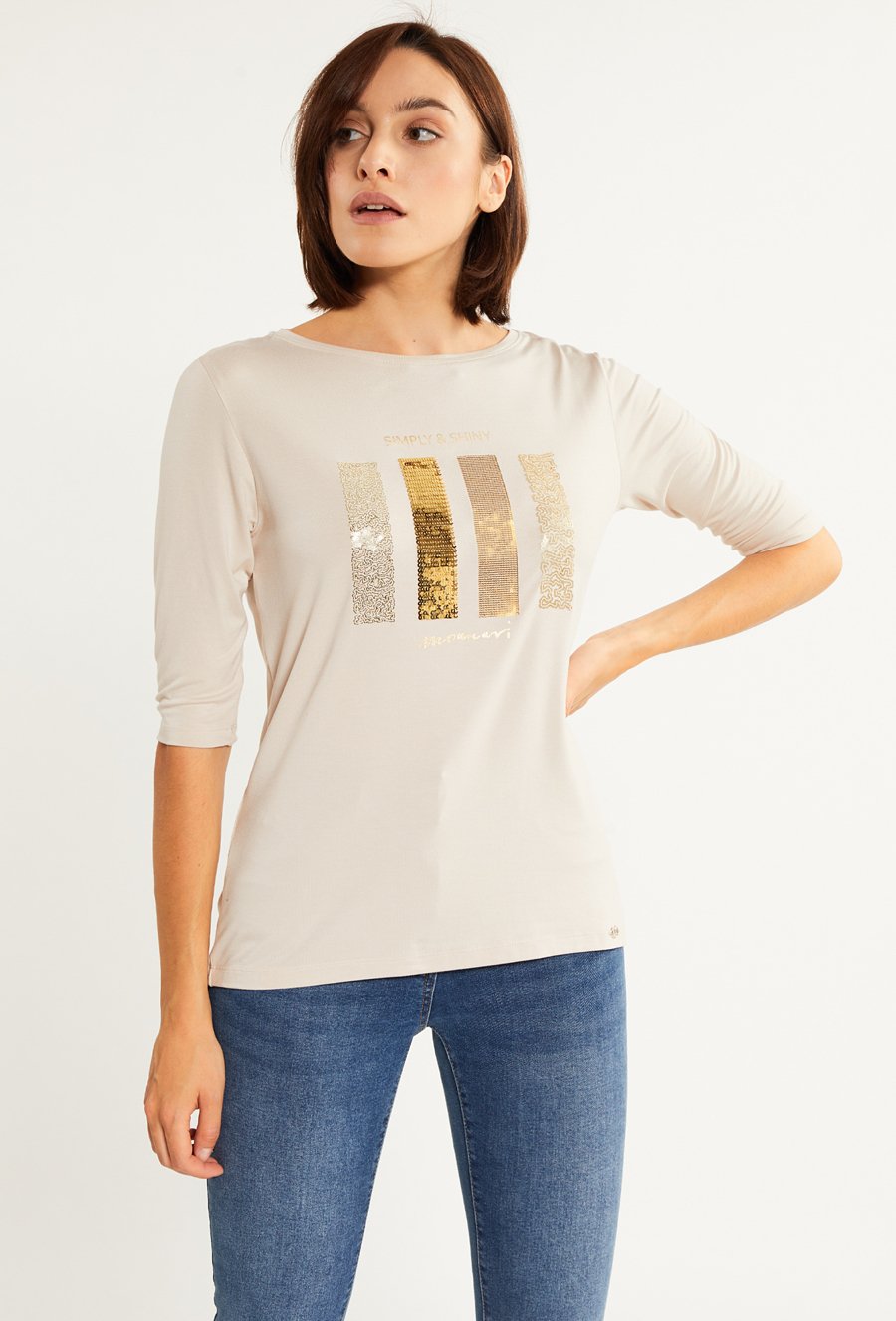 T-shirt z nadrukiem i biżuteryjną aplikacją
