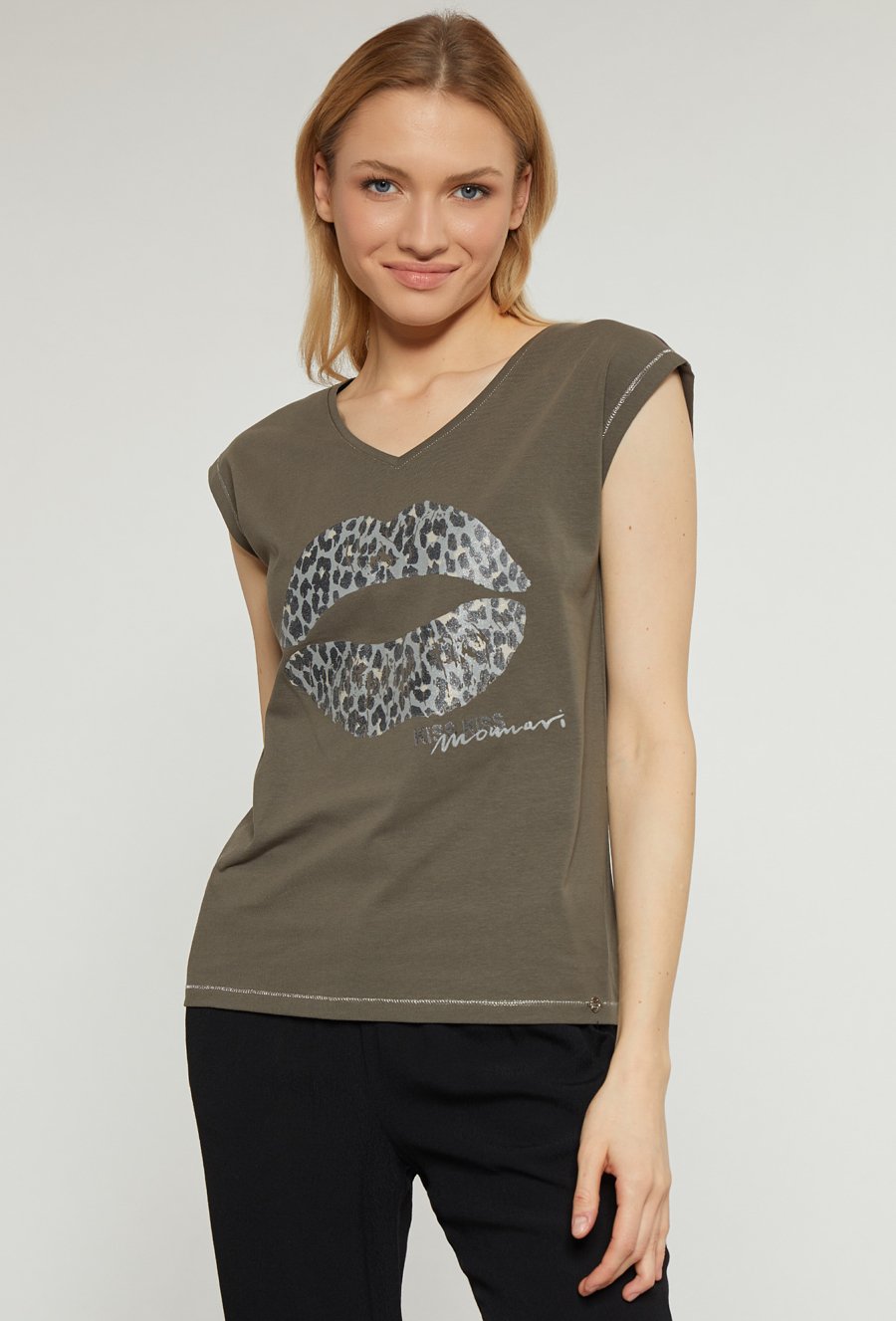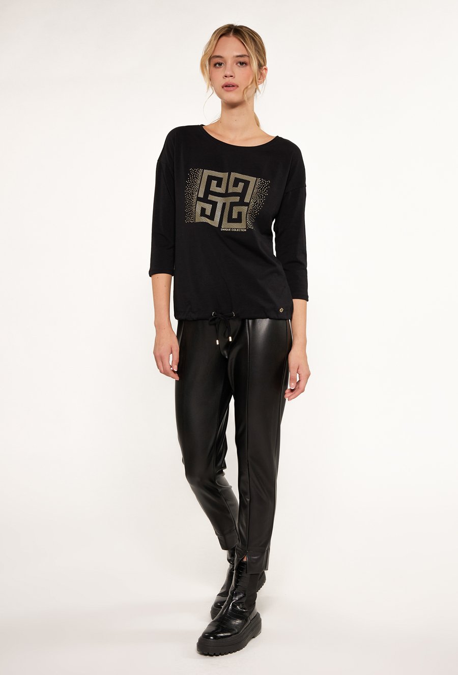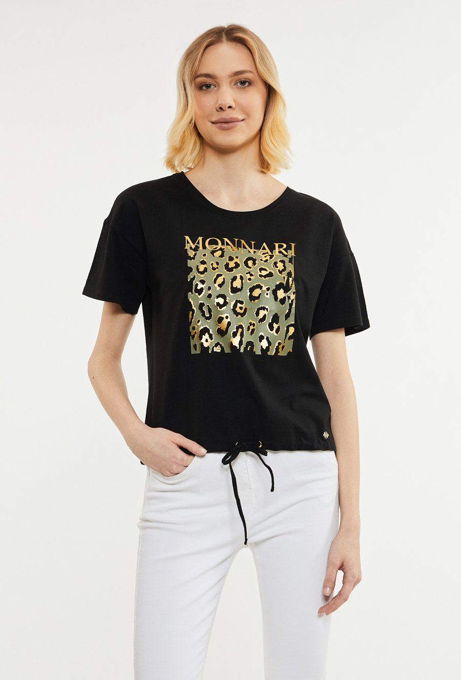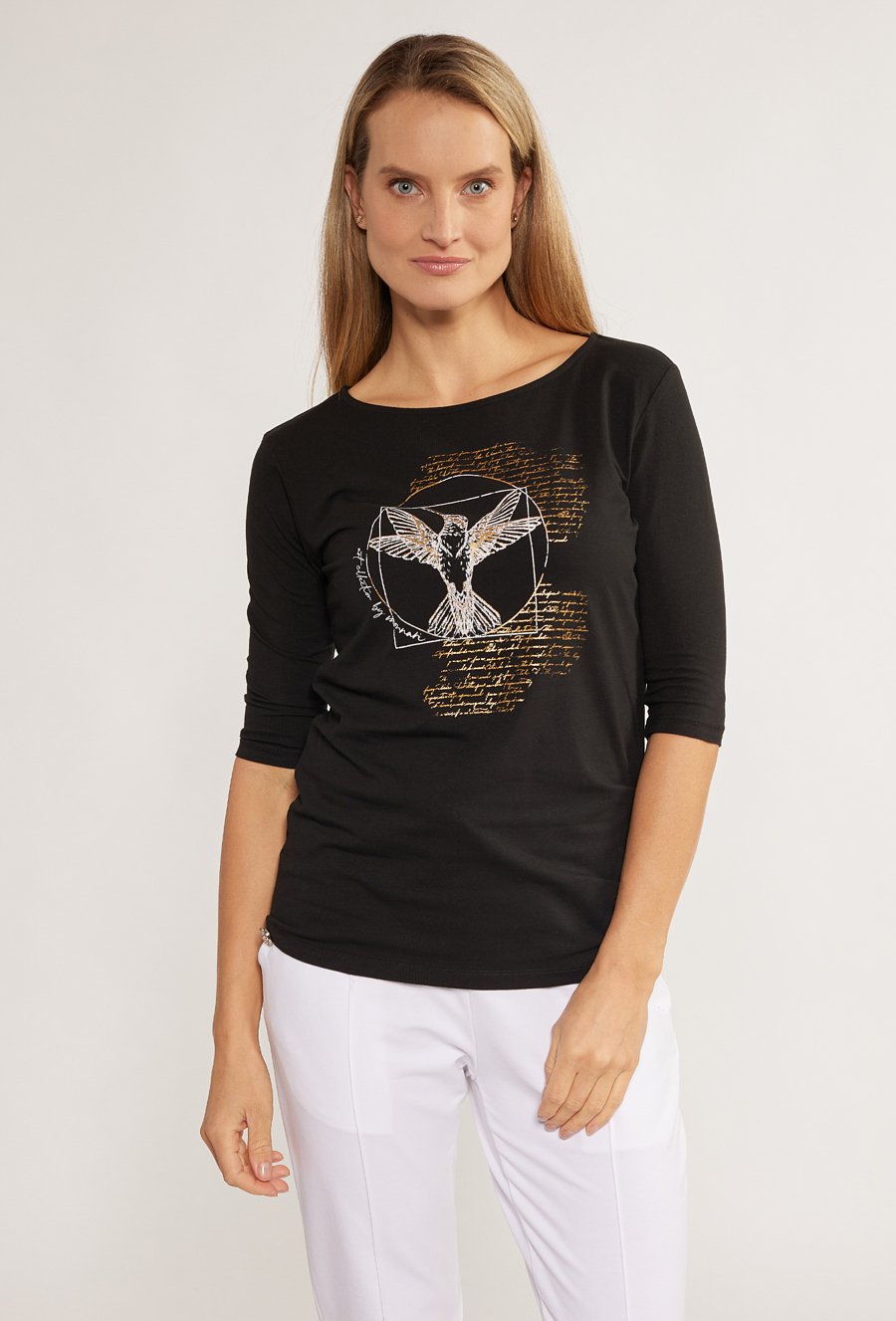 T-shirt z nadrukiem i biżuteryjną aplikacją