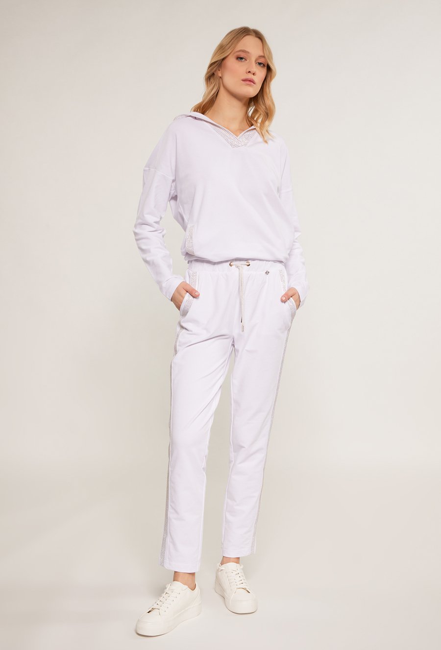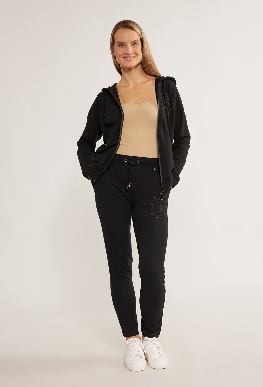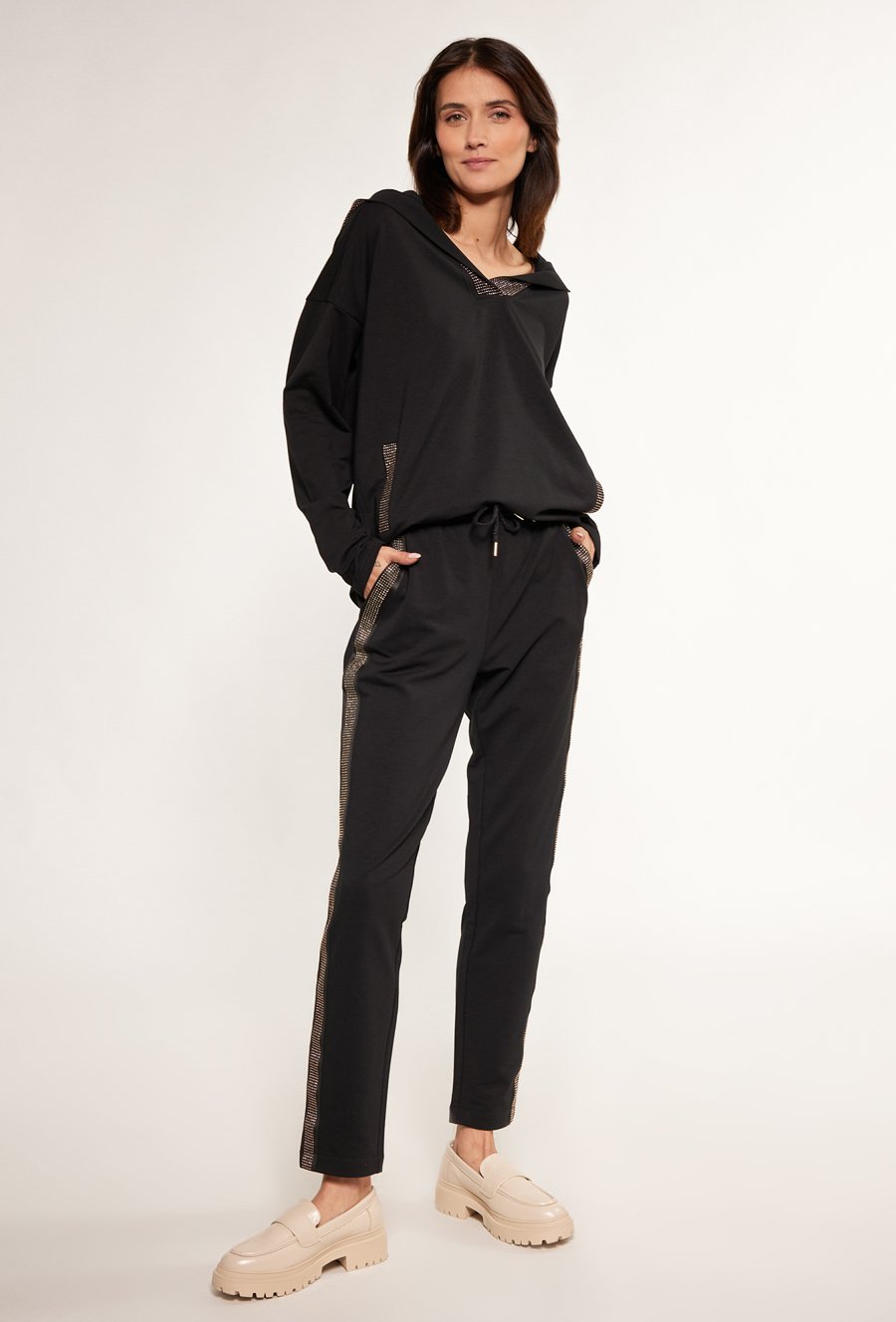 Dresowe spodnie damskie z dżetową aplikacją