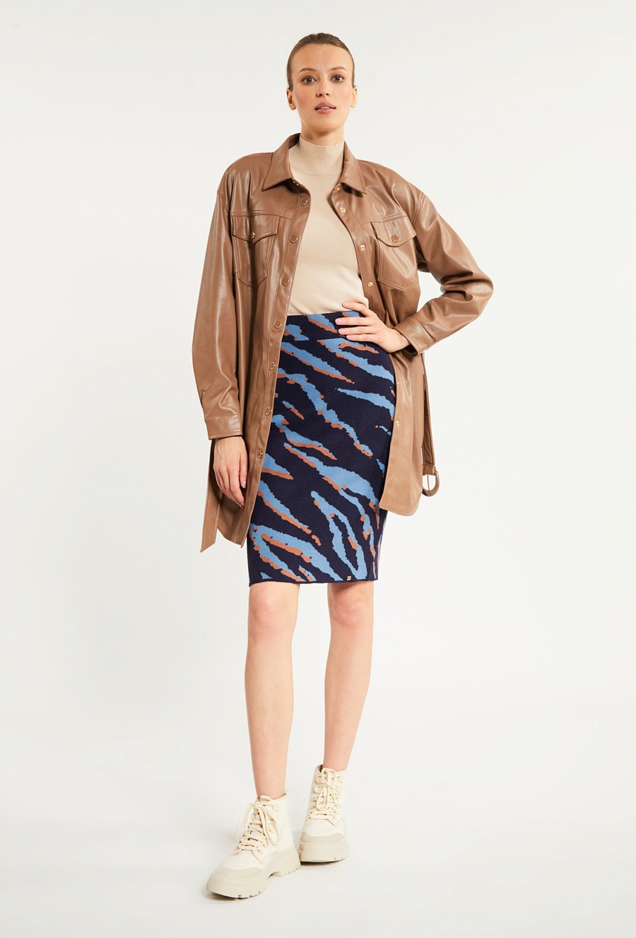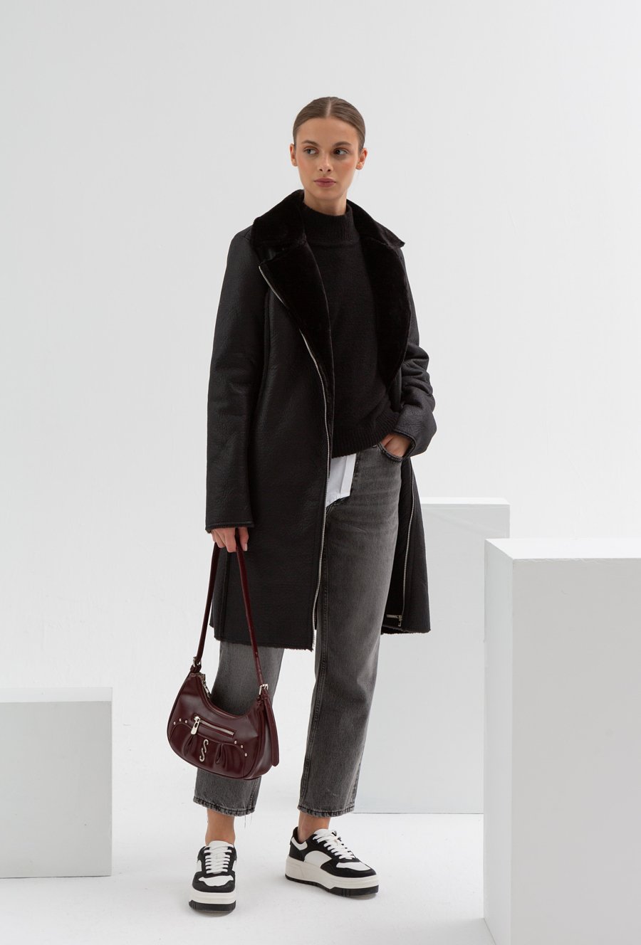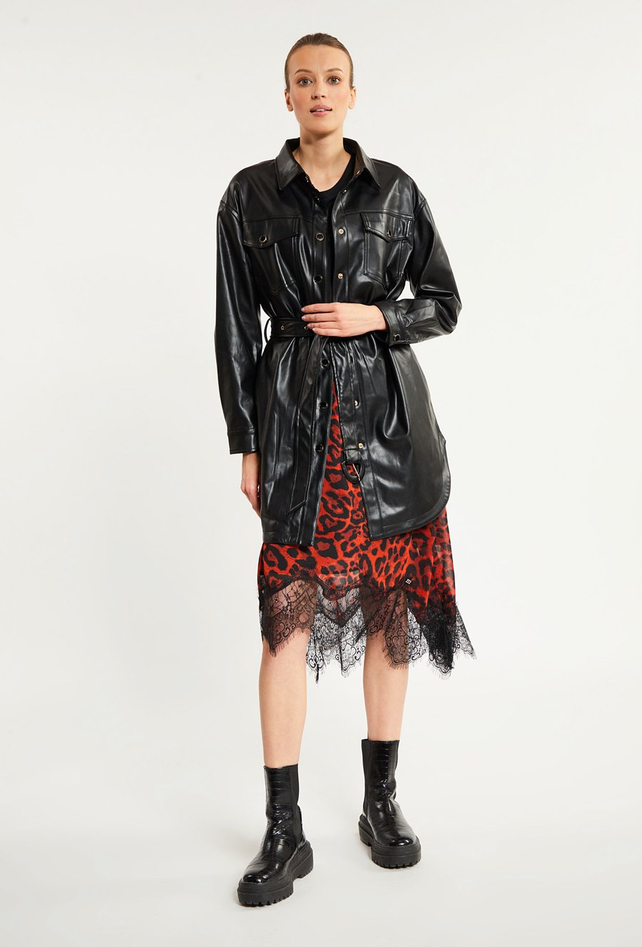 Długa kurtka z ekoskóry z wiązaniem
