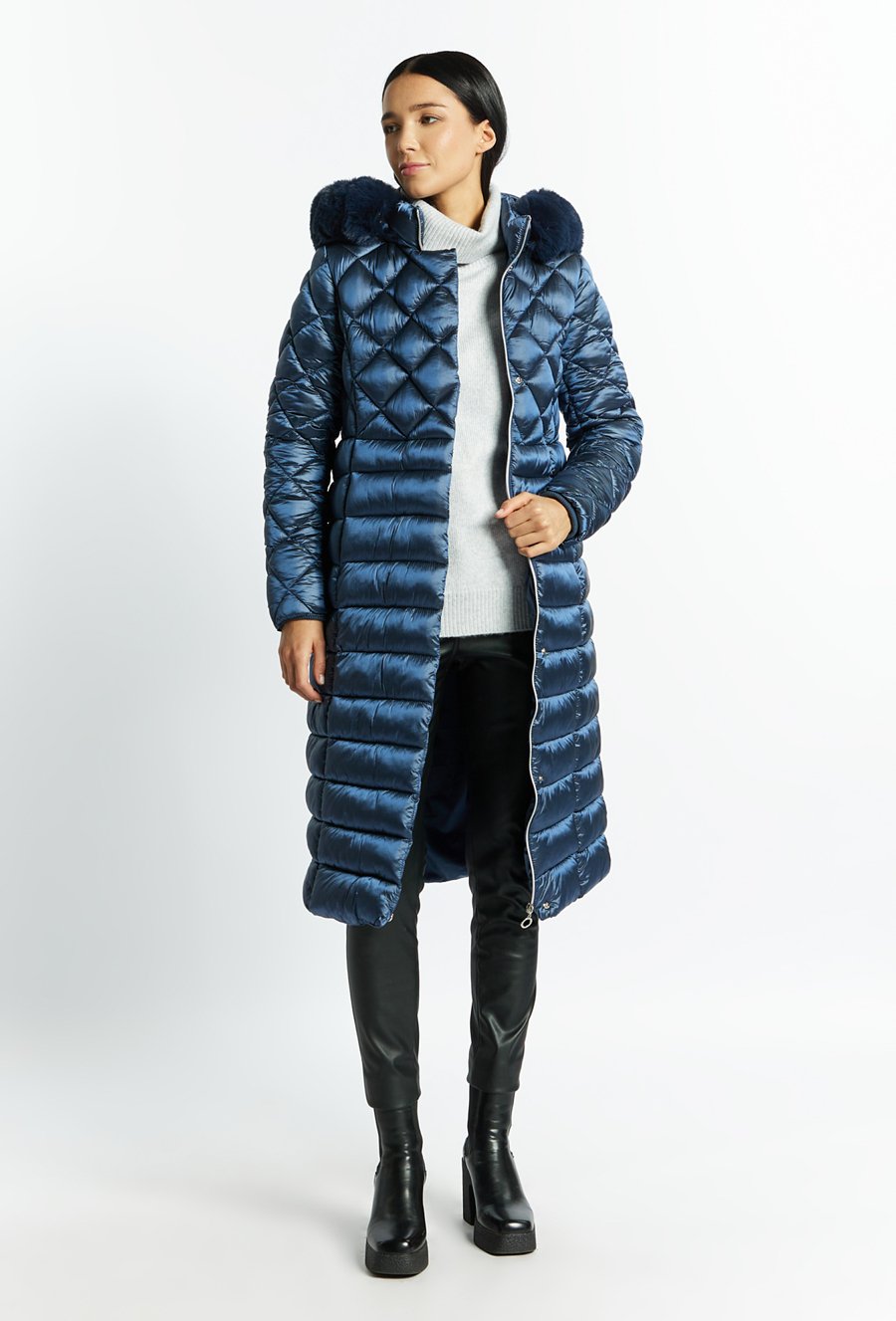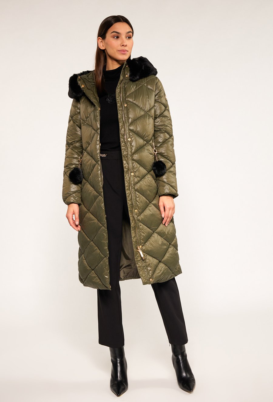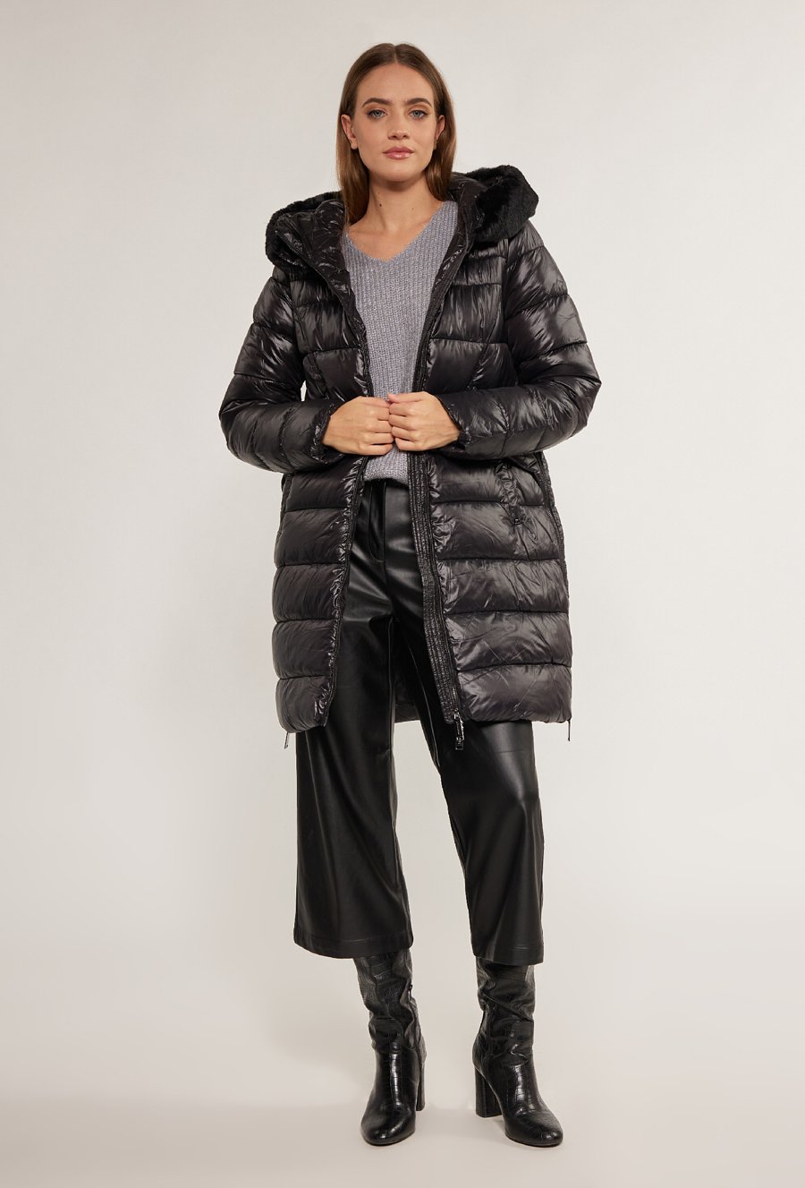 Pikowany płaszcz z futerkiem przy kapturze