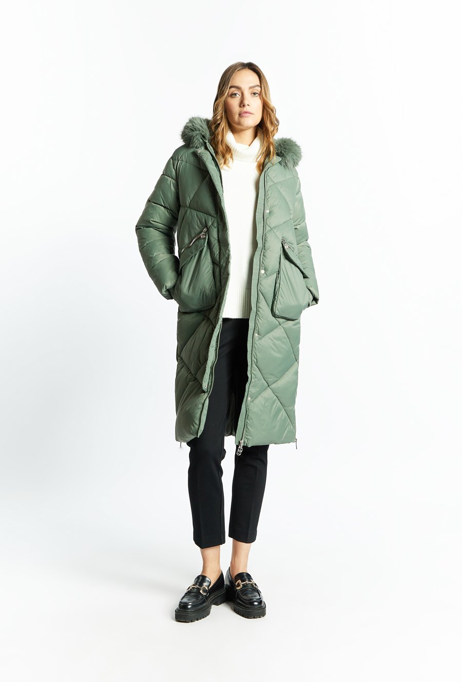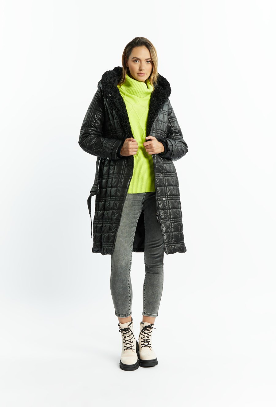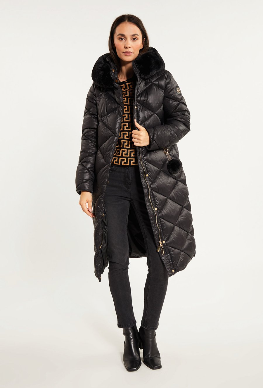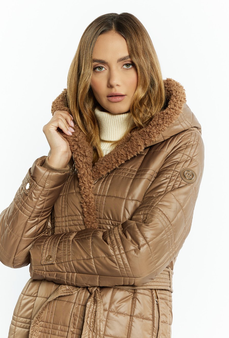 Pikowany płaszcz z futrzanym kapturem