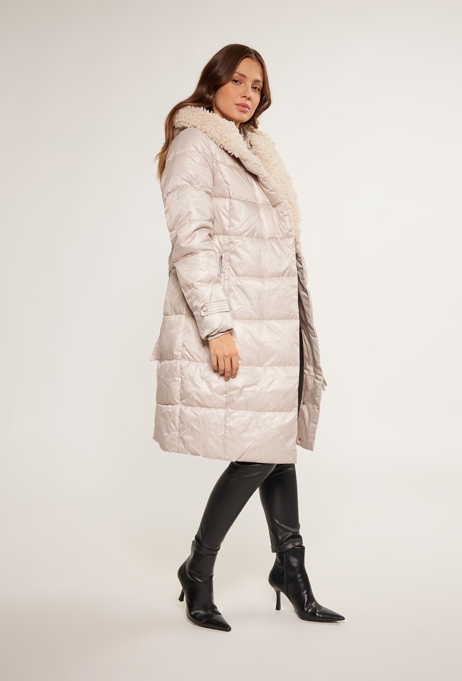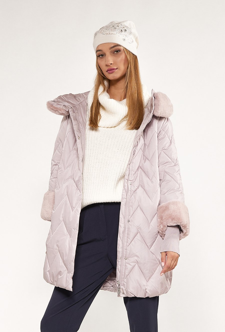 Pikowany płaszcz z futerkiem