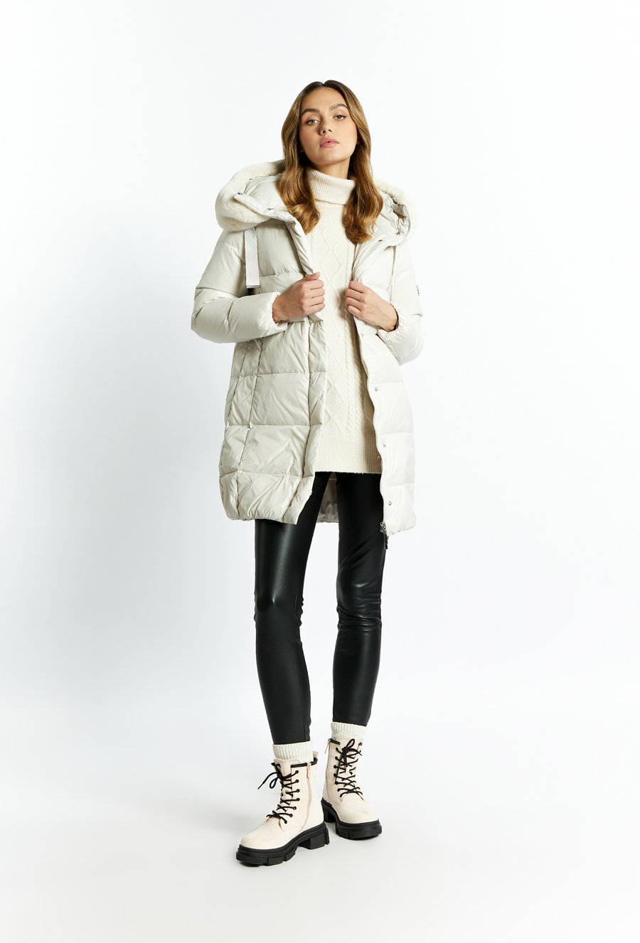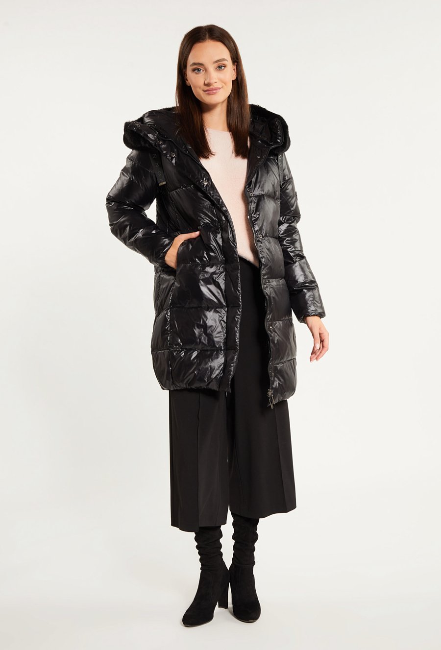 Puchowy płaszcz damski z kapturem