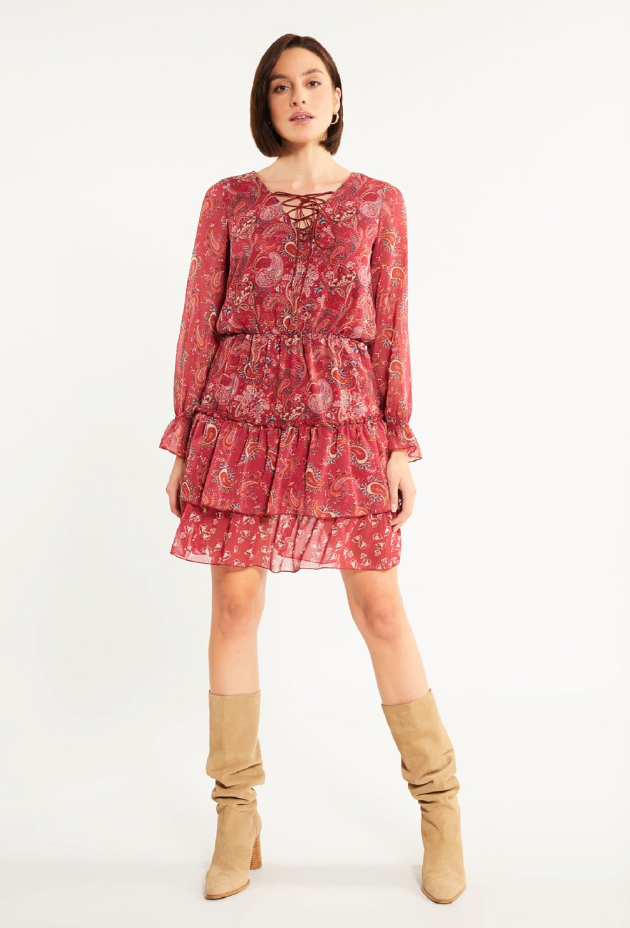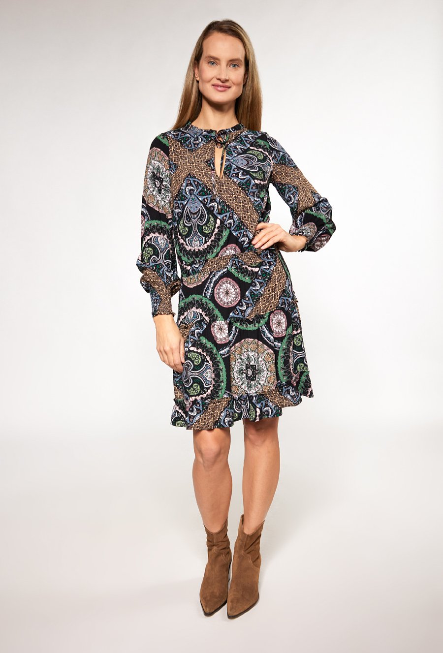 Wzorzysta sukienka z wiązaniem