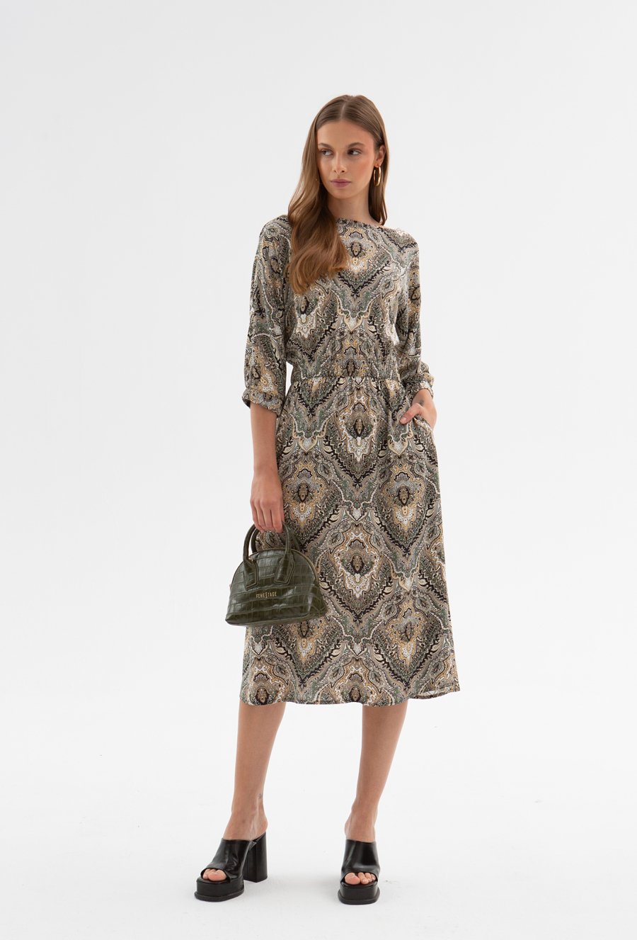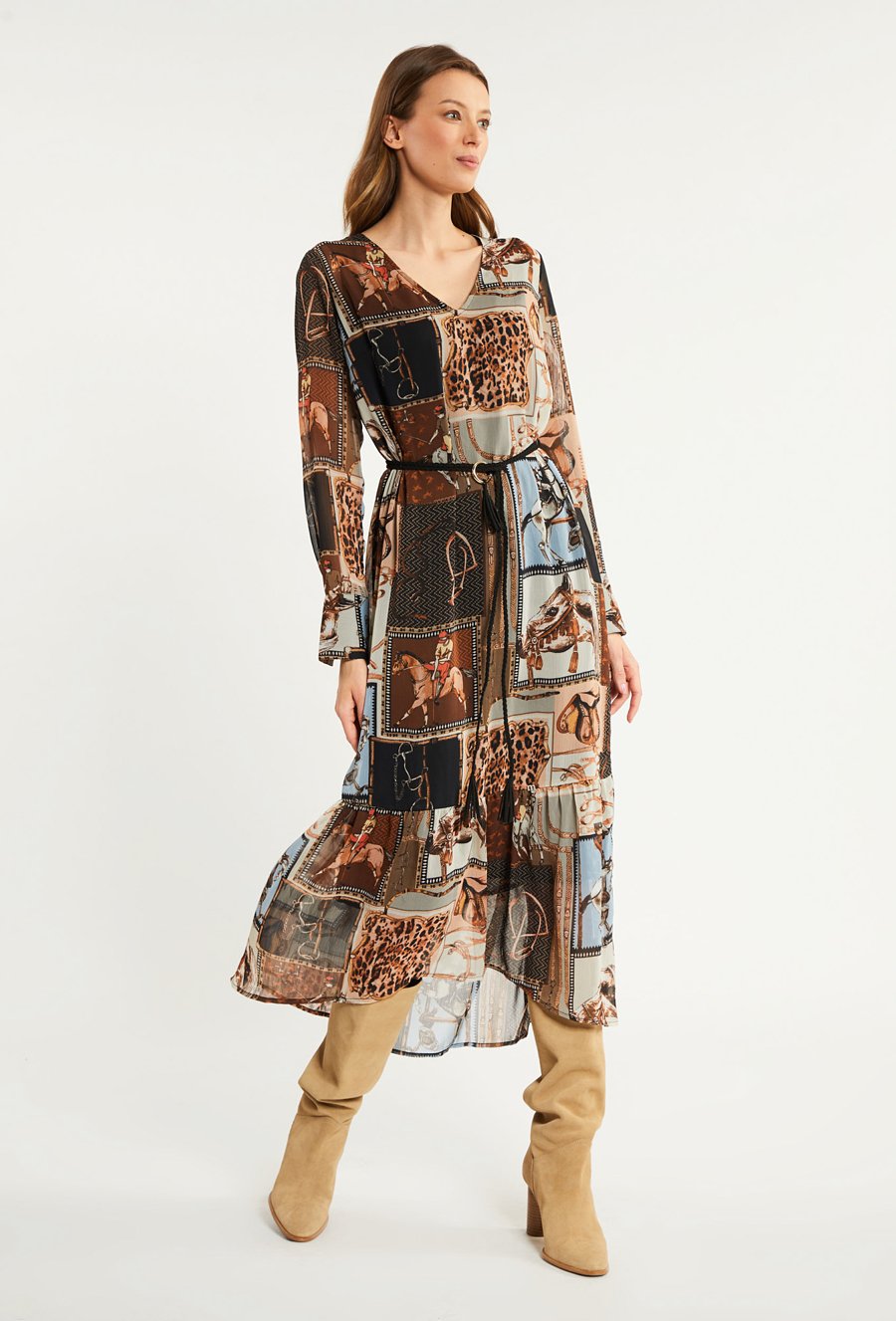 Wzorzysta sukienka midi z paskiem