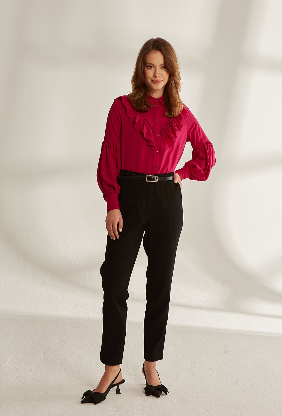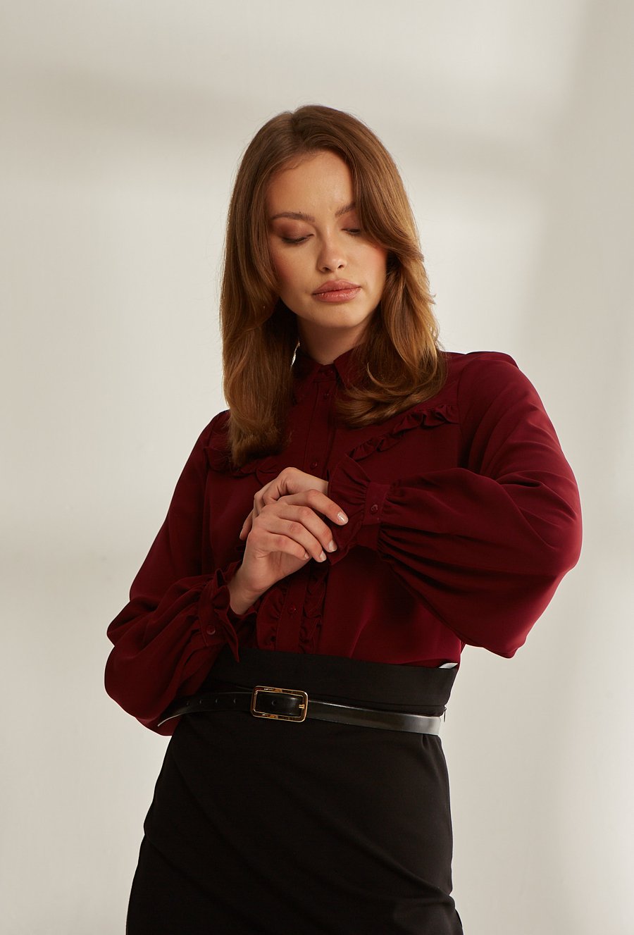 Bordowa koszula z falbanami