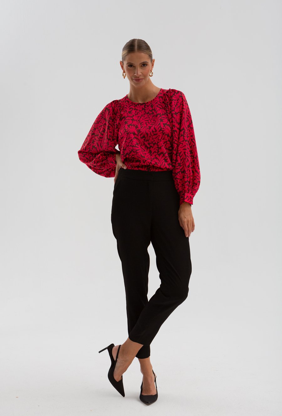 Czerwona wzorzysta bluzka ze stójką