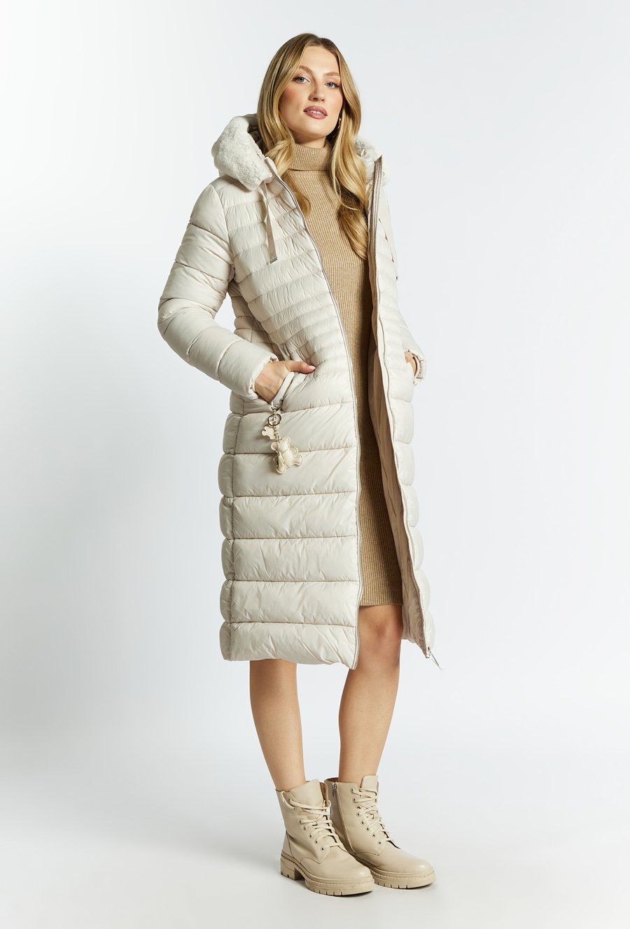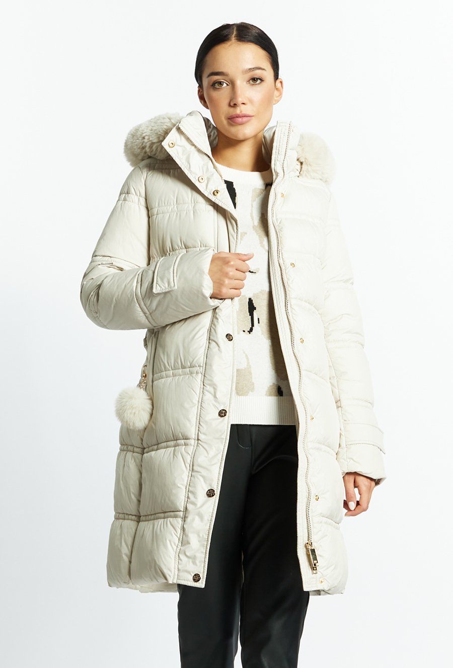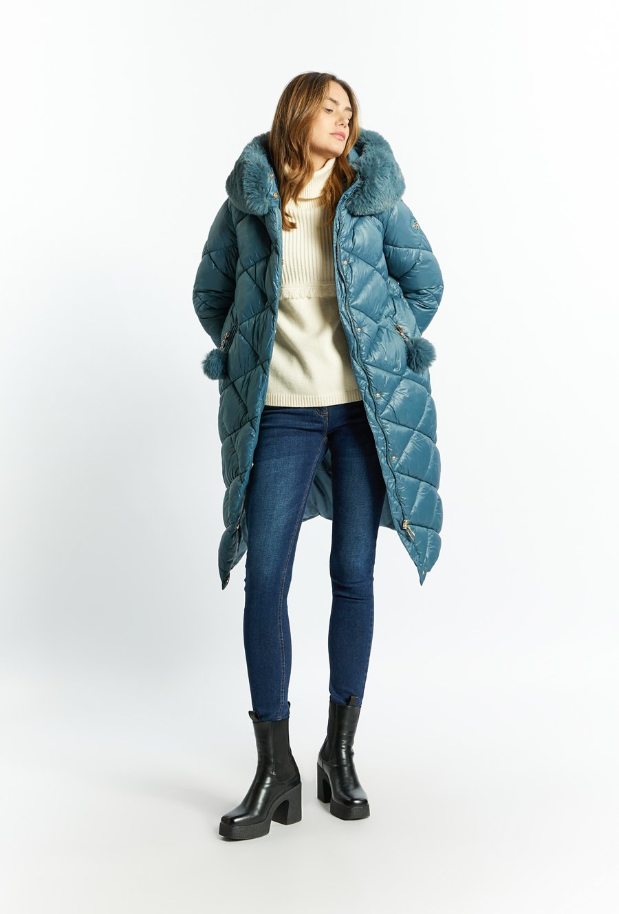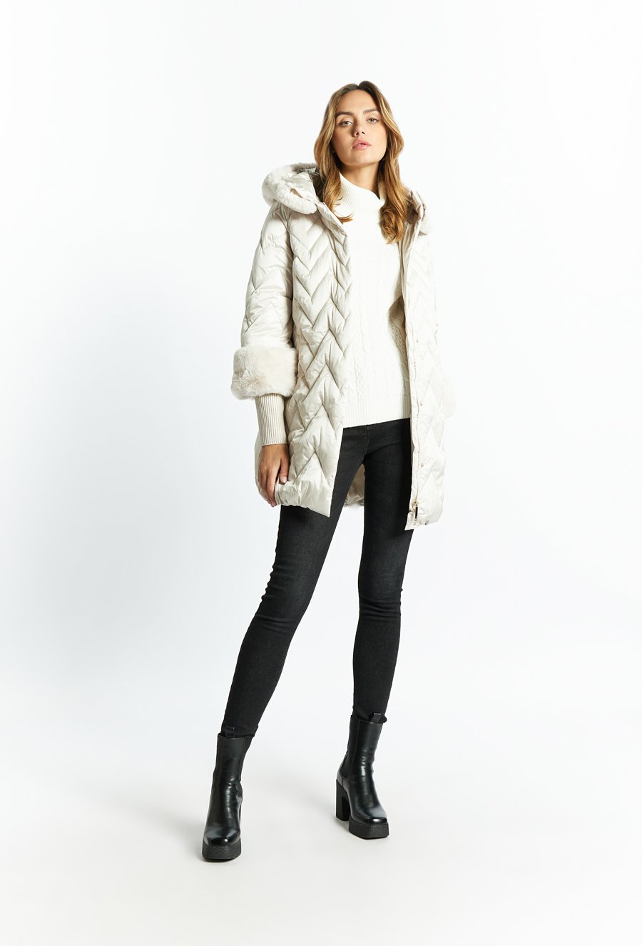 Pikowany płaszcz z odpinanym futerkiem